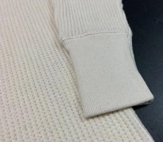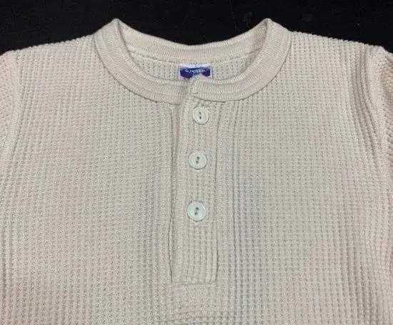 ジェラードのオリジナル生地の厚手のメガサーマルヘンリーネックTです。通常、丈夫で強いヘビーサーマルといわれるものでも30/-(さんじゅうばんたん)糸で編まれたサーマル生地を使用するのですが10/-(じゅうばんたん)サーマル生地を採用してます。サーマル素材の中では最高の肉厚素材であり、見た目にも分かるとおりワッフルの目面が大きく凹凸がハッキリしております。その為、空気の層が入り易く、保温性を高めてくれます。縫製は3本針で縫ってあり、リブは締め付けの強いしっかりとしたリブを使用してます。ネックはよりオールド感を出す為に猫の目ボタンを使ったヘンリーネックです。