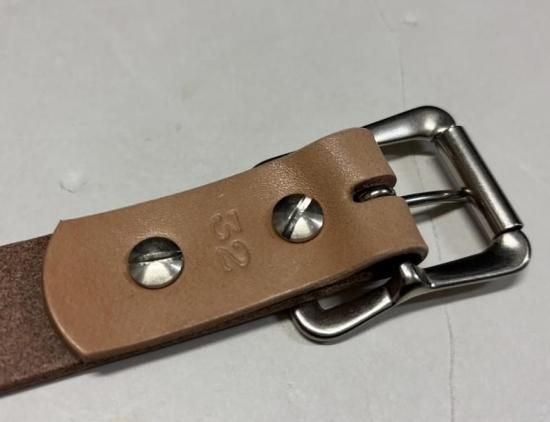 ベルトの革には厚みが5から6ミリのベンズレザーをStandard Rivetを適切に留めれる最大厚を4ミリに加工して使用。バックルは真鍮地のニッケルバックルを使用しています。