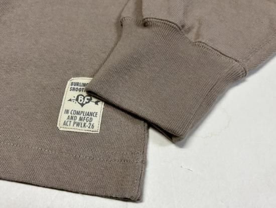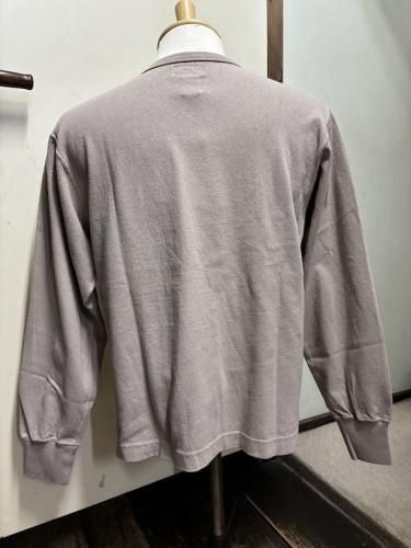 コリンボからウォッシュされたヘヴィーウェイト単糸度詰め天竺コットンを使用した無地ロンTです。10番カード糸を使用し、ザラっとした肌触り心地でしっかりとした質感の仕上がりのボディを使い、縫製は4本針のフラットシームを使い、ショルダー部分には生地の向きを張り替えたパネルを使い、袖口はリブが配されています。ネックはバインダー仕様で左裾にプレートが配されたシンプルな無地ロンTです。