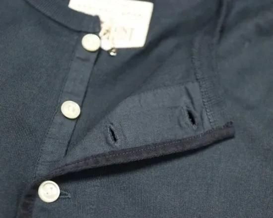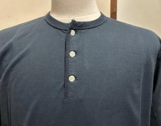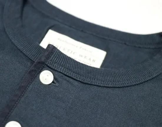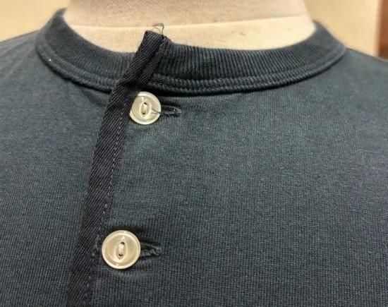 ヘビーウェイトなのに、それを感じさせないストレスフリーな着心地は、糸に空気を含ませる特別な紡績によって生まれ、サイズ毎に丸編みした筒状の素材は、着込めば着込む程に肌にしっかりと馴染んで参ります。ヘンリーネックならではの首元のラインにアクセントが生まれます。1枚でこなれ感のある着こなしを演出してくれる。ボタンを開ければ武骨な印象になるように首元のバインダーも定番TEEに比べて細目にしております。生地は糸に空気を含ませている為、経年変化しやすく、19番手の糸を使用することで本場アメリカのTシャツの様な風合いを再現しました。また、生地の袖付けには4本針フラットシームを使用しており、着用時の不快感を解消。襟はヴィンテージによく見られるハーフバイアスのバインダー仕上げにすることで5年着込んでもヨレにくい構造となっております。その他にも、脇下には伸縮性の高いリブを配するなど、着込めば着込むほど体に馴染んでくるフルカウントの渾身の技術が凝縮された一枚です。裾周りはすべてフライスを用いてバインダーで仕上げ、ヨレを防ぎます。裾はララウンドして着用時広がりを防ぐ為若干絞っています。