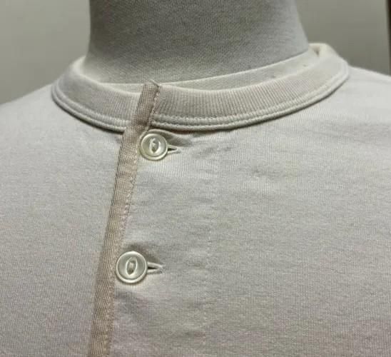 ヘビーウェイトなのに、それを感じさせないストレスフリーな着心地は、糸に空気を含ませる特別な紡績によって生まれ、サイズ毎に丸編みした筒状の素材は、着込めば着込む程に肌にしっかりと馴染んで参ります。ヘンリーネックならではの首元のラインにアクセントが生まれます。1枚でこなれ感のある着こなしを演出してくれる。ボタンを開ければ武骨な印象になるように首元のバインダーも定番TEEに比べて細目にしております。生地は糸に空気を含ませている為、経年変化しやすく、19番手の糸を使用することで本場アメリカのTシャツの様な風合いを再現しました。また、生地の袖付けには4本針フラットシームを使用しており、着用時の不快感を解消。襟はヴィンテージによく見られるハーフバイアスのバインダー仕上げにすることで5年着込んでもヨレにくい構造となっております。その他にも、脇下には伸縮性の高いリブを配するなど、着込めば着込むほど体に馴染んでくるフルカウントの渾身の技術が凝縮された一枚です。裾周りはすべてフライスを用いてバインダーで仕上げ、ヨレを防ぎます。裾はララウンドして着用時広がりを防ぐ為若干絞っています。