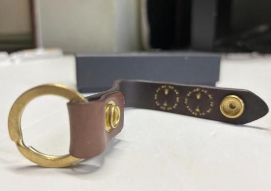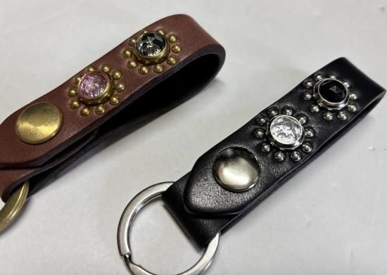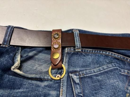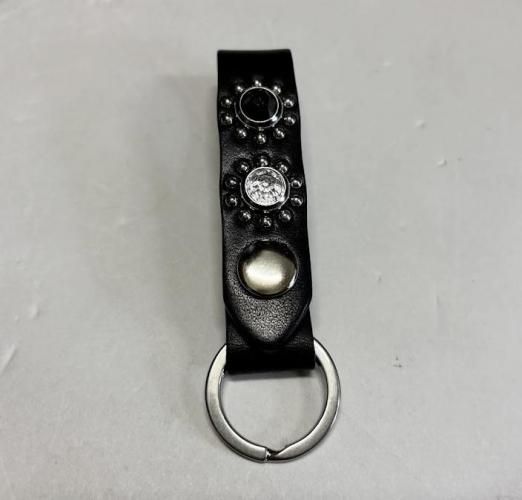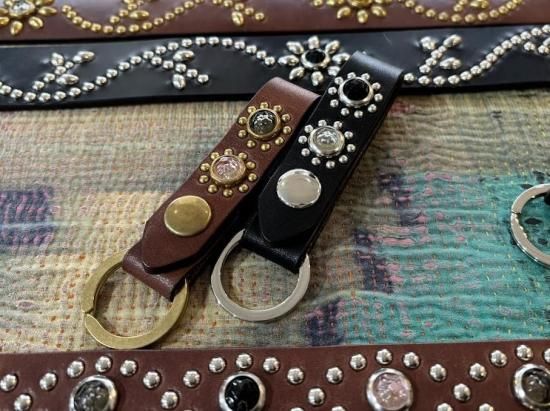 コリンボから新たにスタッズベルトを展開するJEWEL STUDDED LEATHERからベルト同様のベンズレザーを使用したキーリングです。キーリングとしても使え、ベルトを通すことでキャップ等を留めるホルダーとしても使えます。 ベルト幅約2センチ 全長(リング含む)約11センチ
