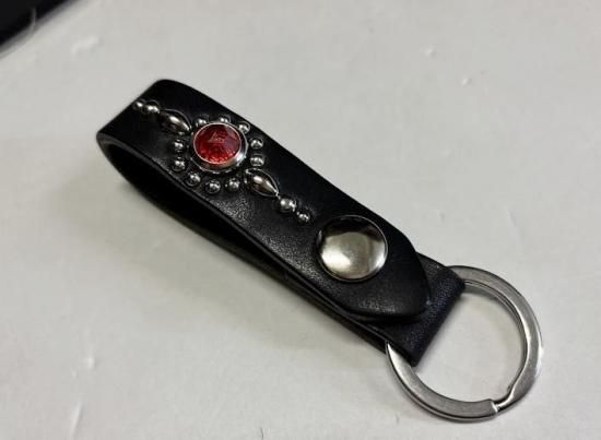 コリンボから新たにスタッズベルトを展開するJEWEL STUDDED LEATHERからベルト同様のベンズレザーを使用したキーリングです。キーリングとしても使え、ベルトを通すことでキャップ等を留めるホルダーとしても使えます。 ベルト幅約2センチ 全長(リング含む)約11センチ