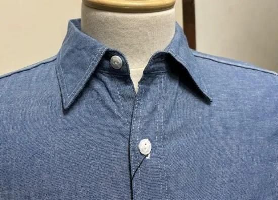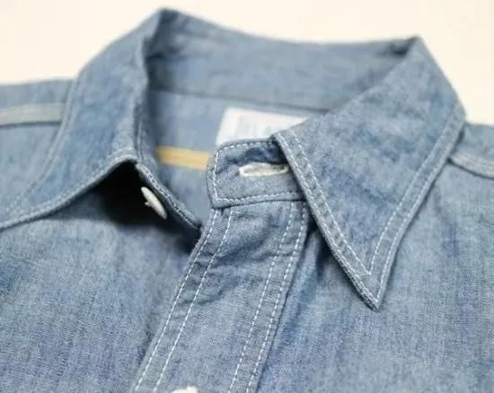 ジェラードから別注のオリジナル生地のシャンブレーワークシャツです。ジェラード定番の型で、洗い加工がされたコットン100%のシャンブレー生地はジェラード所有の20's〜30'sの「BRAVEMAN」のDEADSTOCKのワークシャツの生地から再現して、緯糸(横糸)にムラ感のある糸で、適度な厚さと硬さを持ったしなやかな生地となります。インディゴ染めがされたシャンブレーなので着用すると縦の色落ちやアタリが出て、ムラ感の出てくる生地。型は30年代のビックヤンクのガチャポケ仕様で、綿糸で主要縫製部分はトリプルステッチで、ポケット部分などは、当時と同じ、ダブルステッチを使用しています。ボタンは古いワークシャツなどで使用されている6角形のボタンを使い、両サイド裾のマチは赤ミミタイプです。