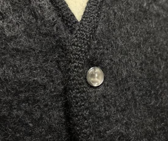 大振りな高級感のあるシェルボタンを使い、シンプルで落ち着いたカラーのカーディガンはベースには60年から70年代を意識したデザインで、近年今は亡きミュージシャンが着ていたことにより人気のアイテムとなったモヘアカーディガンになります。