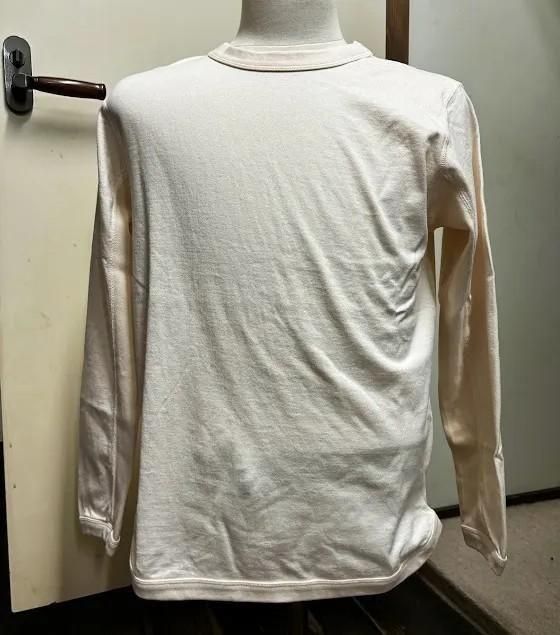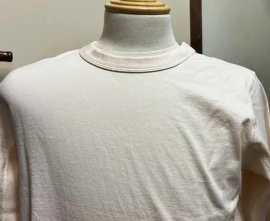 ヘビーウェイトなのに、それを感じさせないストレスフリーな着心地は、糸に空気を含ませる特別な紡績によって生まれ、サイズ毎に丸編みした筒状の素材は、着込めば着込む程に肌にしっかりと馴染んで参ります。糸に空気を含ませている為、経年変化しやすく、19番手の糸を使用することで本場アメリカのTシャツの様な風合いを再現しました。また、生地の袖付けには4本針フラットシームを使用しており、着用時の不快感を解消。襟はヴィンテージによく見られるハーフバイアスのバインダー仕上げにすることで5年着込んでもヨレにくい構造となっております。その他にも、脇下には伸縮性の高いリブを配するなど、着込めば着込むほど体に馴染んでくるフルカウントの渾身の技術が凝縮された一枚です。裾周りはすべてフライスを用いてバインダーで仕上げ、ヨレを防ぎます。裾はララウンドして着用時広がりを防ぐ為若干絞っています。
