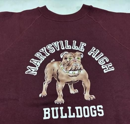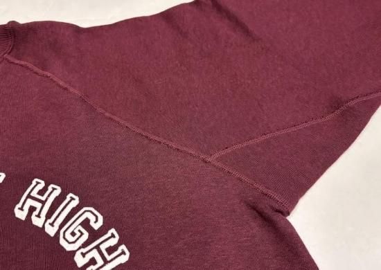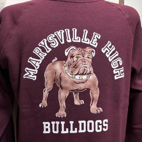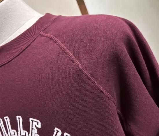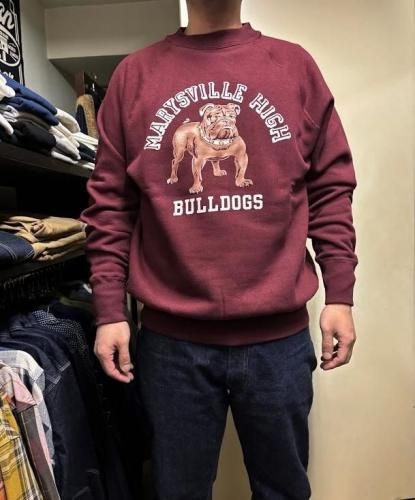 ウエアハウスから大学や高校が共有するスポーツチームのオリジナルキャラクターをフロッキーに着色してカラフルに描いたカラーフロッキーシリーズ。ペナントやスウェットに施されたこれらのカラーフロッキーは、スポーツ観戦や応援など、属する学校や団体の団結のために製造されたものですが、それらは古着となり、年月を経て独特の毛羽立ちや擦れが出て、図柄がなんともいえない味わいに変化しているのが魅力です。ボディはラグランスウェットのボディーに、これらの新品の状態を再現し、着用と洗濯でヴィンテージのような褪色を楽しんでいただけるカラーフロッキースウェットを製作しました。商品は未洗いです。